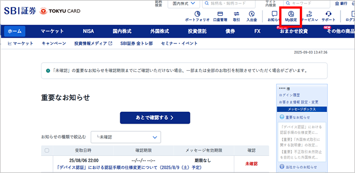 すべての「重要なお知らせ」を確認のうえ、一度画面を閉じてください。